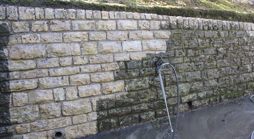 Reinigung einer stark von Moos und Staub befallenen Stützmauer.